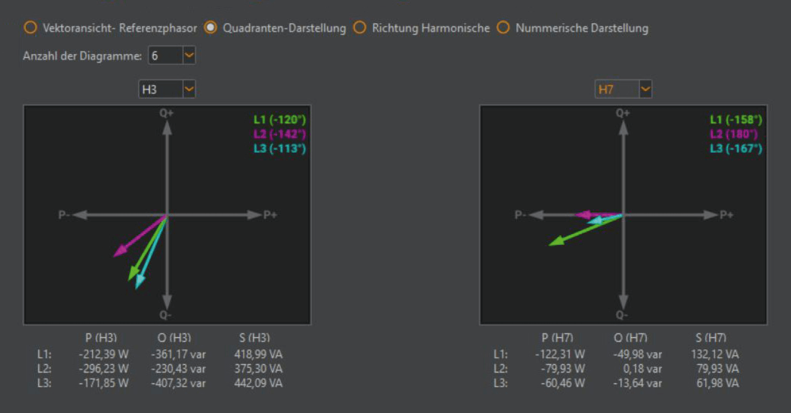 Anzeige der Leistungen und Quadranten in Bezug auf den Winkel phi der Harmonischen