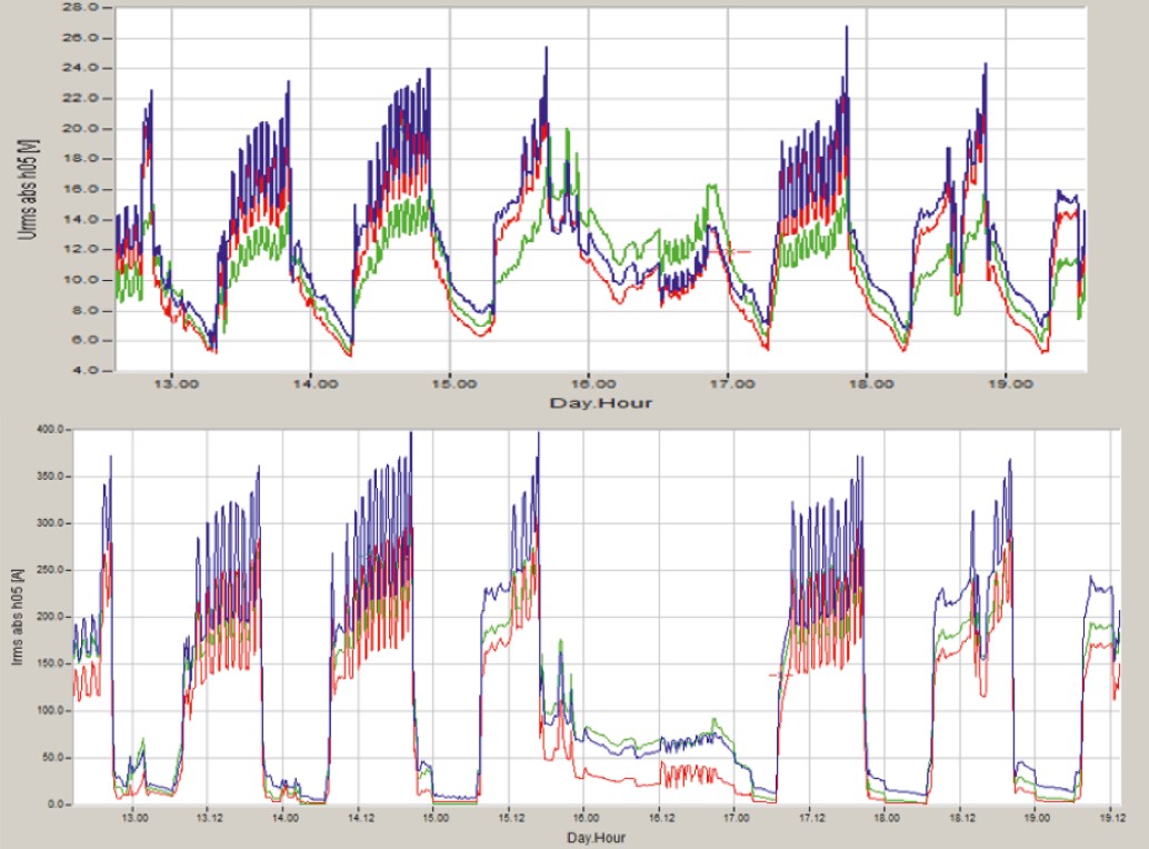 In einem weiteren Messbeispiel (Abbildung 8) sollten in einem Industrienetz mit sehr hohen Oberschwingungspegeln auf der Spannung, Maßnahmen ermittelt werden um diese Pegel sinnvoll zu reduzieren.
