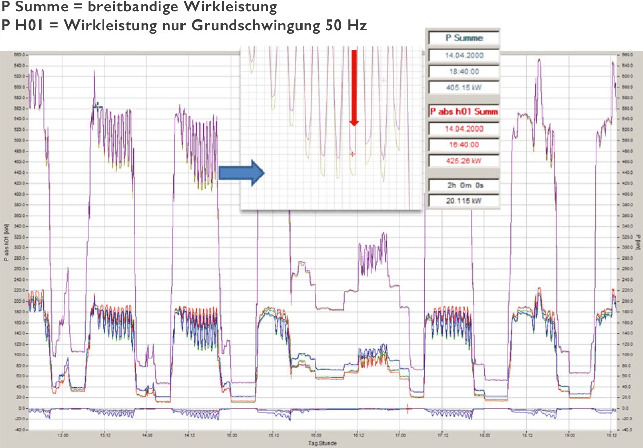 Messpunkt Kundenanlage A war ein Bürogebäude mit vorwiegend einphasigen Verbrauchern wie PC´s, Monitore und Beleuchtungen. Hier wurde ein Strom der 5. Harmonischen von 92 A j(100°) gemessen. Der Messpunkt B lag am Übergabepunkt einer Produktionsanlage mit überwiegend frequenzumrichtergeregelten Antrieben. Hier wurde zu einem identischen Zeitpunkt parallel ein Stromwert der 5. Harmonischen von 123A j(255°) erfasst.