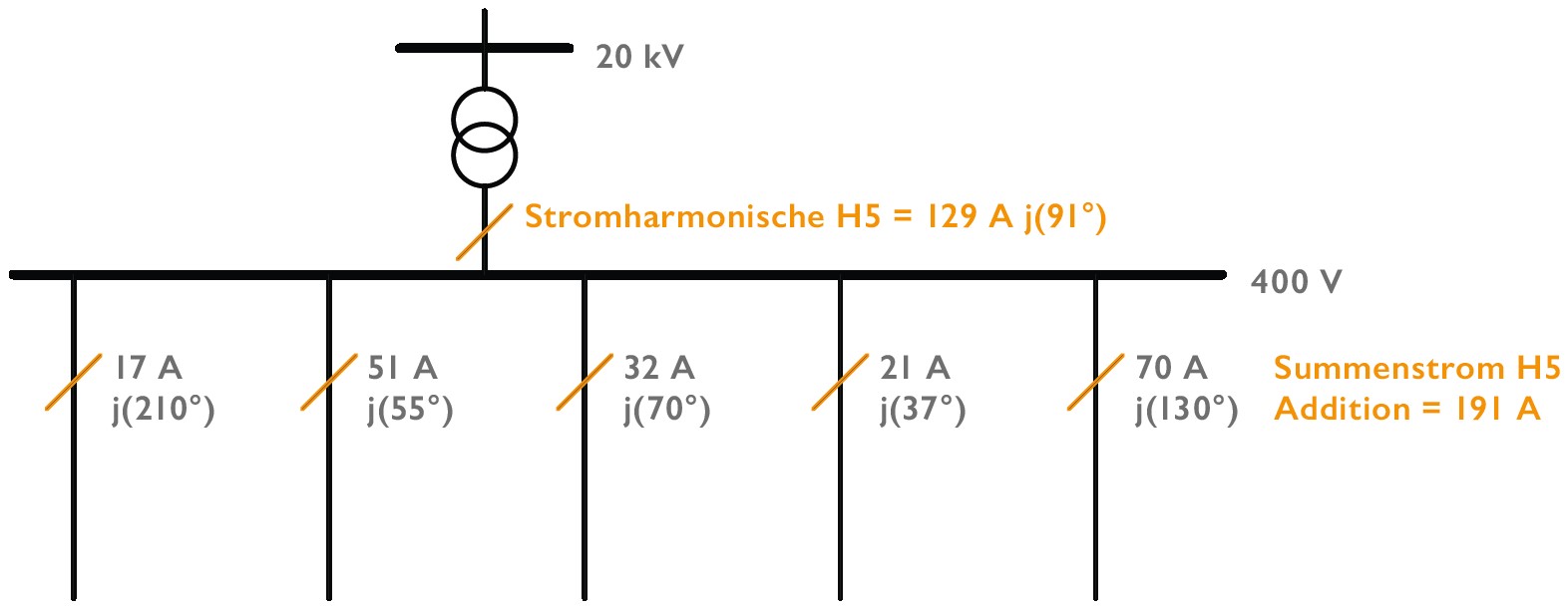 Da die Wirkleistungsflussrichtung von Harmonischen in der Praxis häufig keine Aussage über den Verursacher dieser Frequenzen liefert und jeder Verbraucher, der heute keinen sinusförmigen Strom aus dem Netz bezieht, per se als Oberschwingungsquelle zu sehen ist, stellt sich vielmehr die Frage, wie sich diese vielen Quellen in Netz an ihrem Verknüpfungspunkt addieren. Werden sich diese für das Netz günstig (gegenseitig auslöschen) oder ungünstig vektoriell addieren?