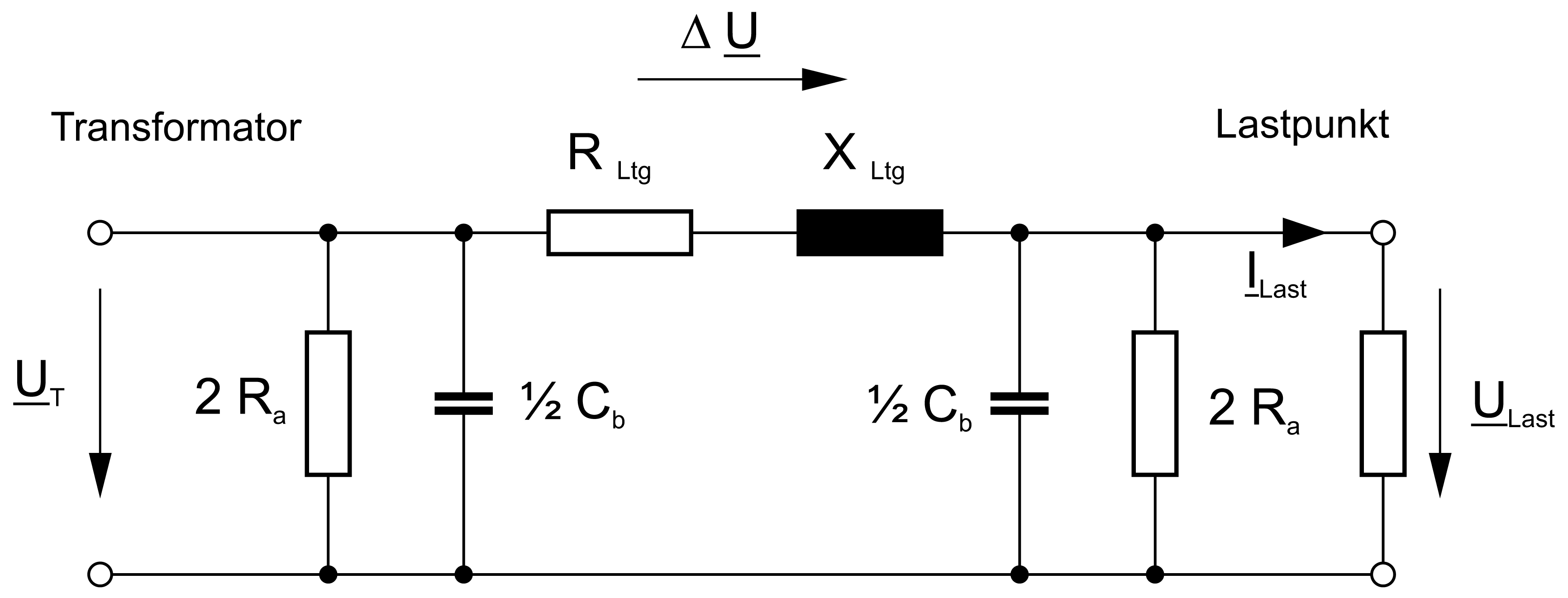 \Delta{U}=U_{T}- U_{Last} = Z_{Ltg}*I_{Last}= \Delta{U}e^{j(φZ_{Ltg}+φI_{Last})}ILast Von der Verbraucherschaltung am Lastpunkt aufgenommener Strom