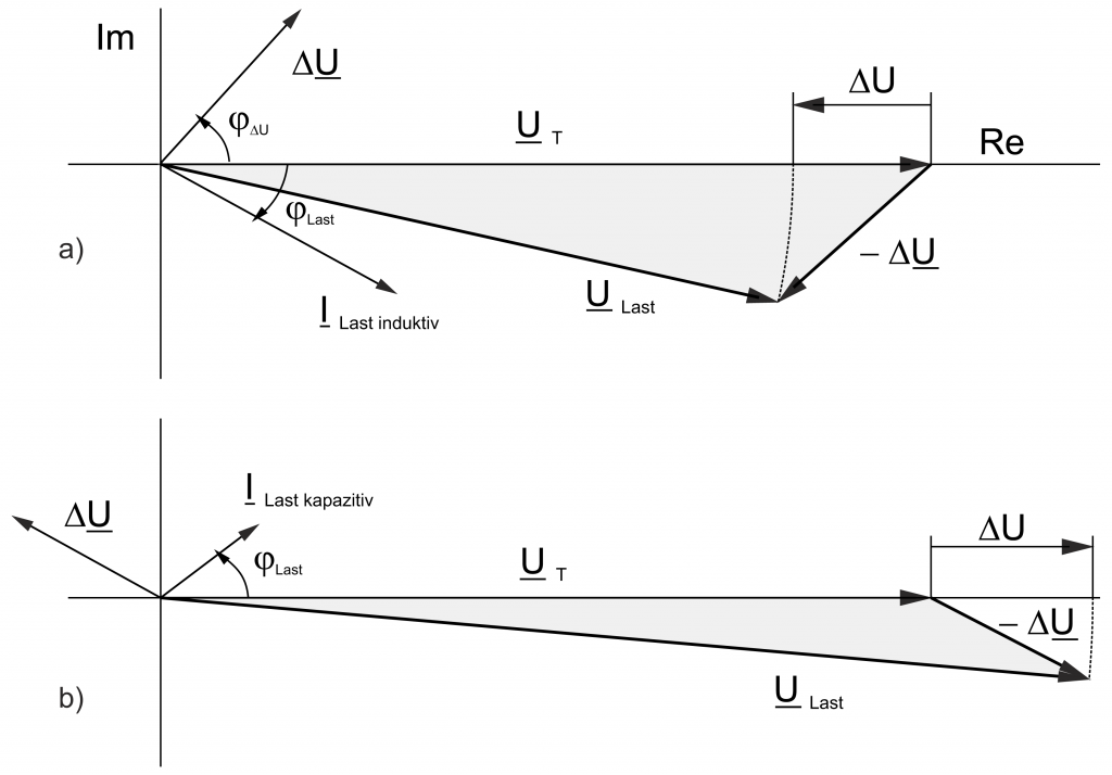 a) Bei induktiver Last ist der Spannungsfall auf der Leitung positiv und somit die Spannung ULast am Lastpunkt niedriger als die Spannung UT am Transformator.
